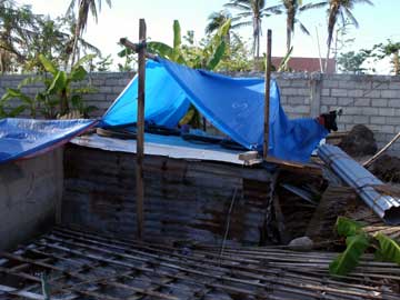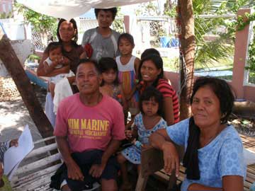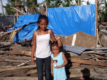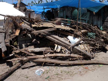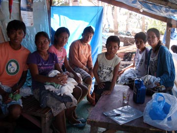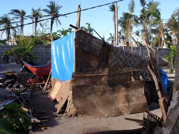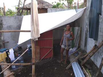 おばさん 左の写真の建材はもらえなかったそうだ。右上の写真のおばさんを訪ねたが、日本だったら、公園のホームレスが住んでいるところに遊びに行くような感じで、少し戸惑ったとも言えるが、その前に行ったバンタヤン島で、私の知り合いの家も余り程度が変わらないので、免疫ができていたとも言える。近くに住む知り合いと同様、左の写真の手厚い支援物資は貰えなかったそうだ。幸運の女神が歩いてきてチケットを切ってくれなかったためで、今後、更なる支援が届くことを願いたい。このおばさんも明るくて、何も支援物資を持っていかないのに、笑顔で、わざわざ来てくれてありがとうと言ってくれた。