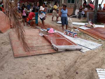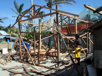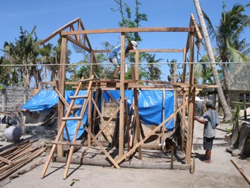 バンタヤン島では、OXFAMの報酬が支払われたこともあり、2月に入って家を再建するところが多く見られた。私の知り合いの家も、2月になって作業を始められた。下の写真の通りで、大工一人、それに家の人が一人手伝っているだけだが、この後、1日で屋根の取り付けまで終わった。私の方は、もっぱら建材を準備する役回りだったが、長く居るとあれが足りない これが足りないと言われかねないので、途中で退散した。