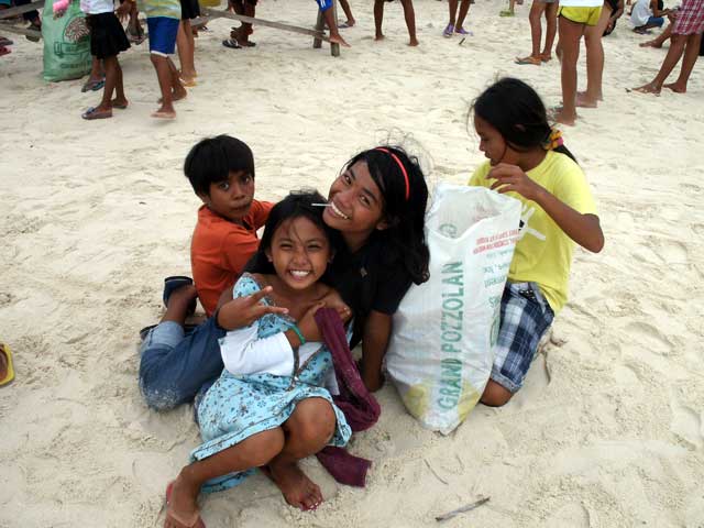 被災者とは思えない明るい子供たち@マラパスクア島 2013年12月 子供たちへの支援物資であるクリスマスプレゼントを配っている会場で、バイトでゴミを拾っている右側の子供の写真を撮ろうとした。すると、別の子供たちが すかさず、横からスライディングして来て、画面をハイジャックした。とにかく陽気で明るいのがフィリピンの特徴で、こちらの方が元気をもらって帰った。