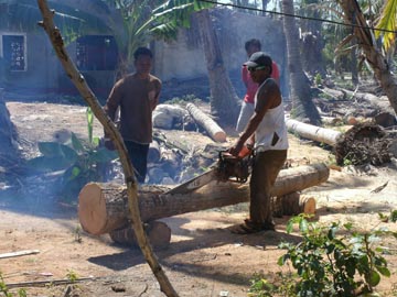 現地では、椰子の木が沢山倒れている。これを切って材木に使えばよいのが、業者にチェーンソーで木を切ってもらう代金が高くて払えない場合が多い。