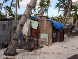 | 適当に建材を集めて作った、仮設住宅(?)の掘っ立て小屋 | 井戸があるので、台風が通過した直後から水は得られた。 | 支援物資がまだまだ残っているが、インスタントラーメンよりも、魚と野菜を食べておいた方が健康によいはずだ。 |