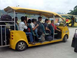 バスの終点バスを降りたら電気自動車で移動する 関所の手前を通る電気自動車 中国のイミグレーション
