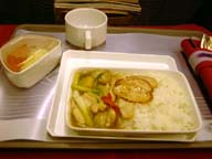 マニラからの便と同様で機材はエアバス. A300が使われていた。国内線だが、そこそこ距離があるので、Cクラスでは軽い食事も出た(写真右)。ただ、夕食の時間帯でも、アルコールを頼むような雰囲気ではなかった。